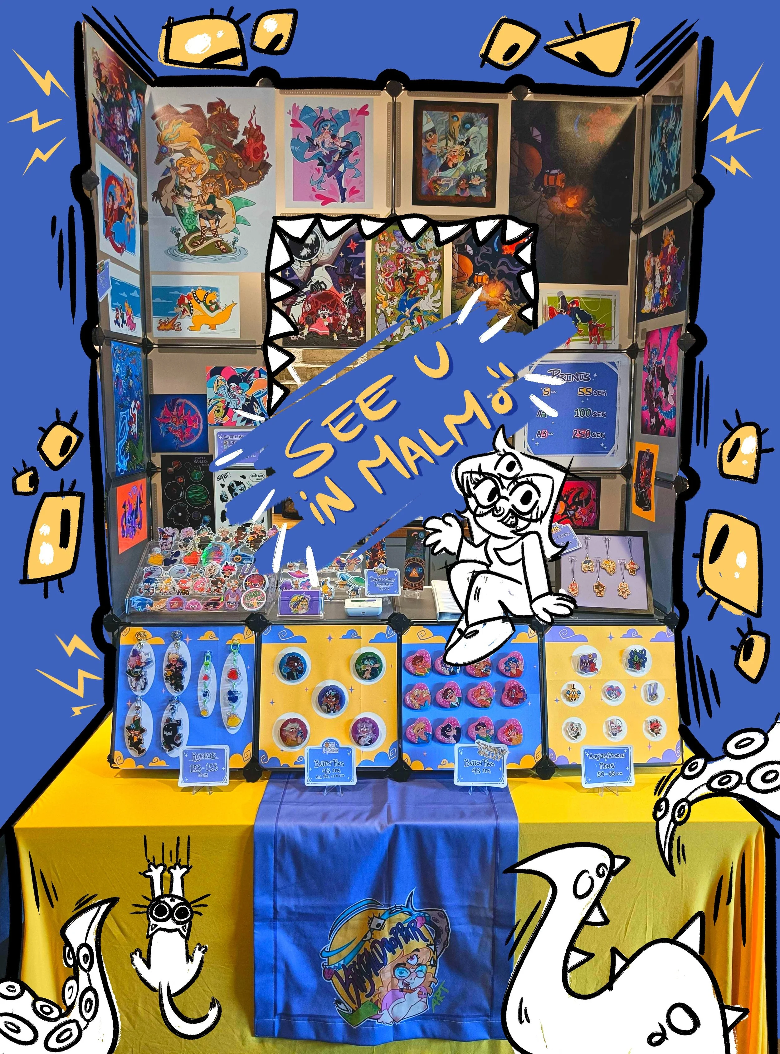 At my booth you'll find prints, enamel pins, and tote bags featuring my artwork. I'll also be bringing copies of my art book.